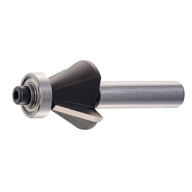 Fasefräser mit Kugellager, zweischneidige Ausführung, mehrfach schärfbar. Hartmetall Schneide bestückt für lange Lebensdauer.